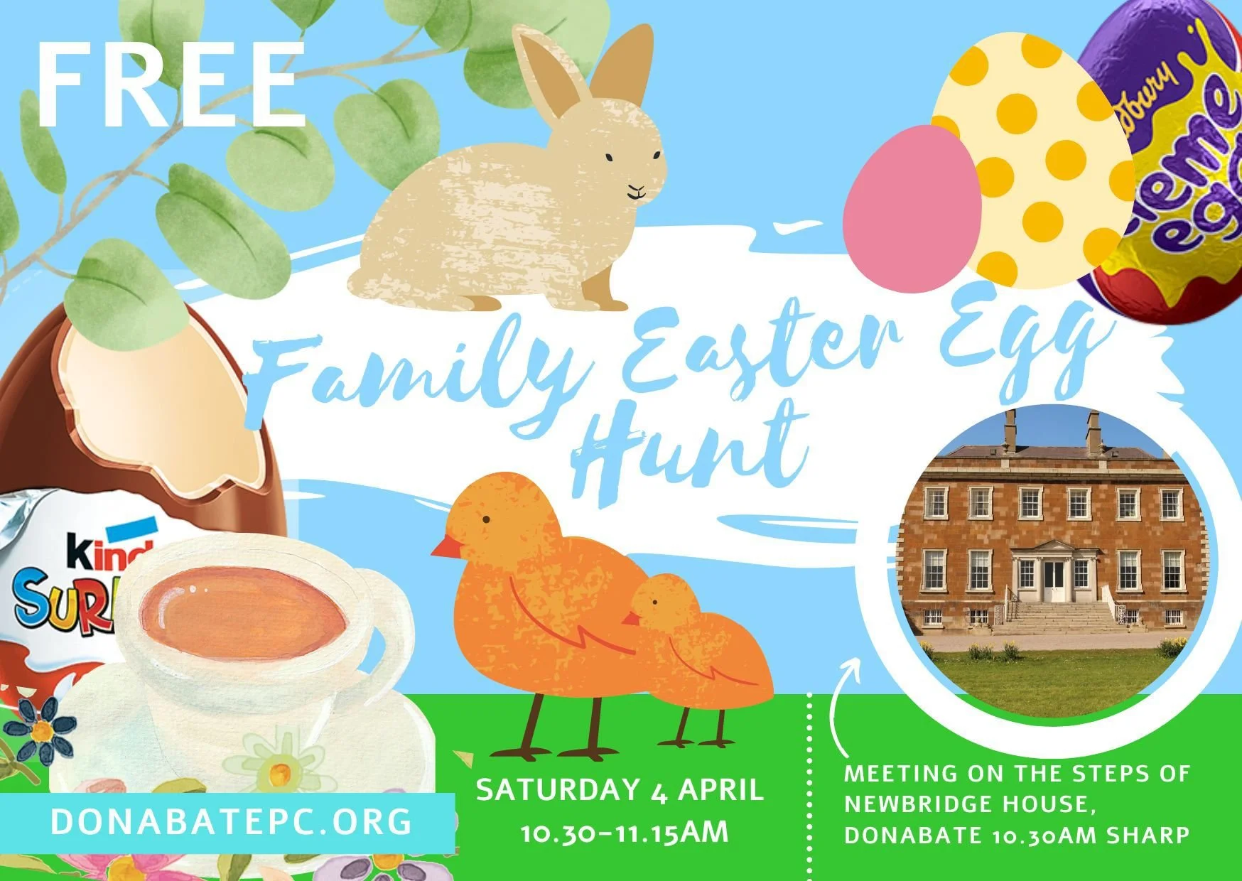Newbridge House, 10:30 am. We start at 10:30 sharp, so make sure you’re there to get plenty of eggs!